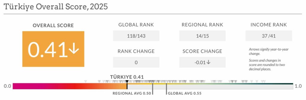 Türkiye, 2025 endeksinde 143 ülke arasında 118. sıraya gerileyerek geçen yıla göre puanını %1,9 oranında düşürdü.